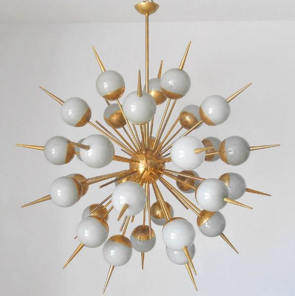 Reproduction of Sputnik design. Murano glass spheres available in white, smoky white and light amber.